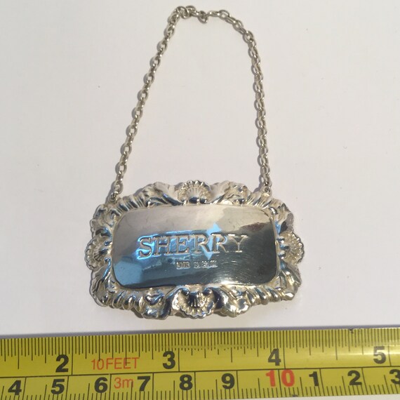 1954 Solid Silver Sherry Spirit Decanter Label By S J Rose & Son Weight ... 1954 Solid Silver Sherry Decanter Spirit Label. Weight 9.04g. Full English Hallmarks for S J Rose & Son, London England 1954. Very nice unusual decorative style decanter label with chain in good condition. Condition is very good Measurements approximately 4.75cm x 3cm (1..7/8" x 1.1/4") 1954 Solid Silver Sherry Decanter Spirit Label. ...