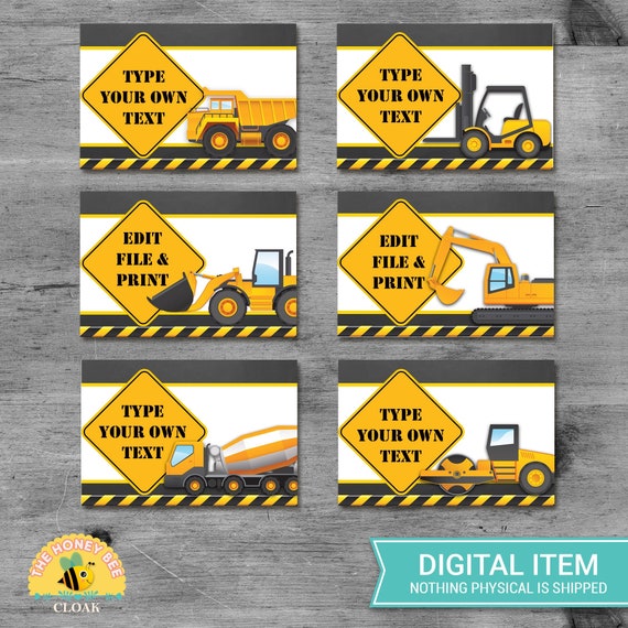 Construction Party Food Labels Printable Instant Download Construction Party Food Labels Printable Instant Download. $4.5. By Mr. Cool. NOTE: *** This listing is for a digital file only. NO PHYSICAL ITEMS WILL BE SHIPPED. There is no return refund accept for any item on this site. Please Read Our Return & Refund Policy before placing an order.***. Include: 1 Template: Construction Party Food Labels - Etsy INSTANT DOWNLOAD Construction Birthday Food Tents Labels (Buffet Cards)--DIY Printable; Construction Dump Truck Yellow Black Boys BeeBeesDezigns (1,136) $3.00 Construction Place Cards, Printable Construction Tent Cards - Construction Labels - Construction Buffet Labels - Construction Food Tents ArcticParty (3,854) $3.37 $4.50 (25% off) Construction Party Food Labels template - Pinterest Construction Party Food Labels template Download, edit and print this Construction Party Food Labels template now. Each folding food label has a dump truck and a yellow & black caution tape background. Personalize with your own food items by typing over my sample text at home using Adobe Reader. Get creative with construction theme food